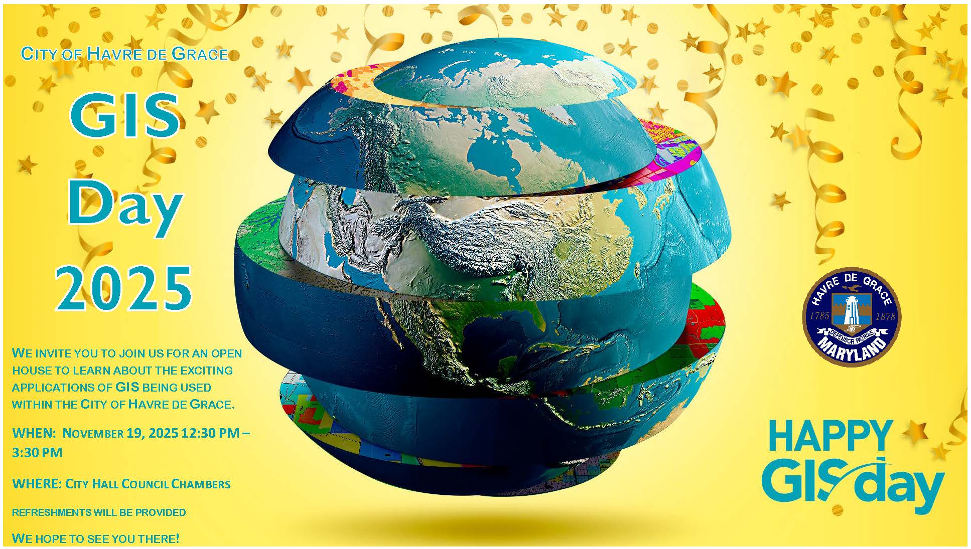 GIS Day 2025 – November 19, 2025 Havre de GraceGIS Day 2025 – November 19, 2025 GIS (Geographic Information System) is a computer-based tool which stores, analyzes and maps location data. The City of Havre de Grace uses GIS in its daily operations and is excited to share the GIS Apps created by the Planning Department with the public. Please join us at City Hall on November 19, 2025 from 12:30 pm-3:30 pm to learn more about the great things the City is doing in GIS! Refreshments will be served.